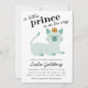 Chamadas de duche de bebê com ilustração adorável de um príncipe de gato verde-menta. O gatinho está vestindo uma coroa e deitado com um sorriso no rosto. O texto acima da ilustração diz "um pequeno príncipe está a caminho". A informação do chá de fraldas está debaixo do gato. Os textos são facilmente editáveis online. Ilustração original e design do Namibear Art Studio. ©BELGA_REDE