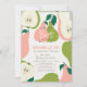 Este doce e moderno "um par está a caminho" é um cartão de convite para chás de fraldas que apresenta peras cor-de-rosa e verdes e fatias de pera em um fundo creme moldado por uma borda verde-clara. O verso apresenta um fundo verde claro com padrões de pera. Personalize-o para as suas necessidades. Você pode encontrar produtos correspondentes na minha loja.