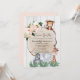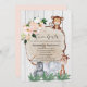 Uma fatia de madeira rústica com spray floral de pelúcia no convite do chá de fraldas da esquina. Há animais da selva sentados na grama. Perfeito para as gêmeas a caminho. Personalize facilmente com as informações da sua festa.