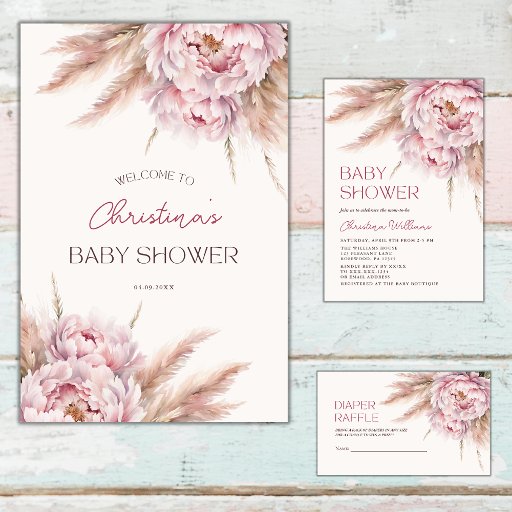 Torne o seu chá de fraldas inesquecível com este convite para aquarelas florais moderno. A design apresenta belas peônias cor-de-rosa-pincelado e grama-pampas, fazer-a na moda e charmosa. Use as ferramentas de design para personalizar o texto, as fontes e as cores. Também disponível como download.