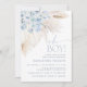 Este elegante convite para chás de fraldas apresenta uma ilustração de cor d'água de pampas boêmia, azul empoeirado e branco. Está a acompanhar o tema de erva dos pampas e fará o convite perfeito para o chá de fraldas do teu bebê. Use os campos modelo para adicionar suas informações e personalizar este convite. Entre em contato com o designer se precisar de assistência para adicionar suas informações.