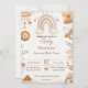 Este convite para o chá de fraldas apresenta uma paleta colorida quente e suja com um arco-íris estilo aquarela, nuvens fofinhas e estrelas no topo. Ao redor da fronteira estão adoráveis itens de bebês como um chocalho, pacificador e garrafa, todos em castanhos e beges macios. A design exude uma víbora acolhedora e acolhedora vibe perfeita para celebrar uma nova chegada.