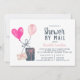 Cancelamento de última hora? Evento de longa distância? este é um chá de fraldas perfeito por convite por correio com um envelope de aquarela fofinha, presente embrulhado por dois balões cor-de-rosa neon e cor-de-rosa pastel com forma de coração. Um tema marinho azul e chá de fraldas rosa.