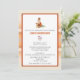 Um convite de chá de fraldas desenhado com uma imagem de aquarela de uma raposa-mãe e bebê. A raposa está olhando para sua mãe com amor e apreço. Ambos sentados em um pouco de grama. Um cupcake no centro do convite. Laranja e listras bronzeadas no fundo.