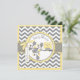 Coruja amarela doce empoleirada em um galho de carvalho de bolota e arco 3D e fita para um cartão de convite de chá de fraldas feminino. As cores são amarelos e cinza.