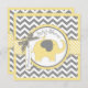 Elefante amarelo com pássaro empoleirado no ombro e cinza e impressão de chevron branco e cartão de convite para chá de fraldas de aparência 3D e fita.