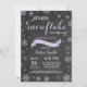 Convite para Chá de fraldas de inverno. Floco de neve roxo. Convite para Chás de fraldas. Convite para Chá de fraldas de férias de inverno. Flocos de neve roxos e brancos. Fundo Chalkboard. Para mais personalização, clique no botão "Personalizar" e use nossa ferramenta de design para modificar este modelo.