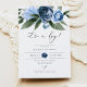 Este convite para chás de fraldas apresenta florais azuis empoeirados de cor d'água e um layout simples elegante. Este é o convite perfeito para o seu jardim ou chá de fraldas boêmico. Edite com facilidade o texto *maioria* para atender às necessidades do seu evento.