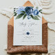 Este convite para chás de fraldas apresenta florais azuis empoeirados de cor d'água e um layout simples elegante. Este é o convite perfeito para o seu jardim ou chá de fraldas boêmico. Edite com facilidade o texto *maioria* para atender às necessidades do seu evento.
