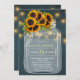 Modelo elegante e russo de convite de festas chá de fraldas com um vibrante buquê de girassóis laranja amarelos e cordas de luzes cintilantes quentes em volta de um grande pote de mason transparente em um fundo de quadro comum azul-escuro da meia-noite. Preencha suas informações nos pontos, — O convite é adequado para a noite de verão ou outono no quintal do jardim floral. | país rústico | fazenda ou rancho bebê ou chá de menina ou gênero revelam festas.