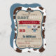Impressão de fundo de vaca e jumper de bandana, meias de inicialização de cowboy e fralda na placa de convite do chá de fraldas de linha de clothesline design em vermelho, azul e castanho.