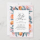 Convide familiares e amigos para o seu evento com este convite de chá de fraldas de tema laranjas. Apresenta uma estrutura botânica de cor aquosa de laranjas e flores cor-de-rosa de laranja. Personalize adicionando nomes, data, hora, local e outros detalhes do evento. Este convite para chás de fraldas de laranjas é perfeito para chás temáticos de verão e citros.