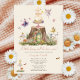 Tema do chá de fraldas de fadas com ilustração do toco florestal rodeado por cogumelos, borboletas, insetos, fadas e flores silvestres. Stump é tocado com bolo tocado com sinal de "É uma garota".