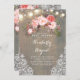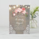Convites de fazenda de churrasco/churrasco de bebê apresentam um buquê floral rosa incrível, um fio de luzes, rendas e madeira.