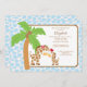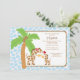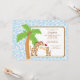 Adorável e moderno safari Chá de fraldas convite de uma girafa-mãe girafa com sua girafa de bebê em um fundo de impressão de girafa azul com uma palmeira safari. Perfeito para um convite de chá de fraldas. Correspondência, notas de agradecimento, autocolantes e postagens disponíveis em nosso compro. © Desenhos do Zenware