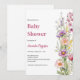 Um fundo branco chic. Decorado com flores silvestres em rosa, roxo, amarelo. Personalize e adicione o nome da mãe a ser e os detalhes da festa.
