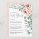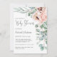Um convite de chá de fraldas, belamente feminino, que inclui um buquê de canto de papoilas, rosas, eucalipto e verde oriental em bege pastel, rosa, verde e azul-esverdeado. Os emparelhamentos faciais do tipo de tendência incluem script manuscrito e serif elegante. Este convite é uma escolha excelente para a futura mãe que está esperando uma menina. Personalize o modelo de texto fácil de usar com os detalhes do evento.