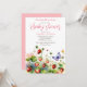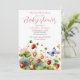 Modelo de convite para chá de fraldas de morango doce de berço, prado de aquarela com morangos com floração, verde e borboletas pequenas