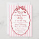 Convite à apresentação de Chá de fraldas de Amorango Vermelho Berry Strawberry Simples e doce Amorango quirky convite ao chá de fraldas com dois morangos, um quadro oval decorativo e arco sobre um fundo listrado branco e vívido, cor-de-rosa. A parte de trás do convite apresenta o padrão e o quadro distribuídos.