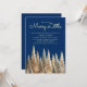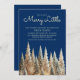 O design apresenta um tema chá de fraldas "Feliz Pequeno Chá de fraldas" Marinho Azul e Ouro com árvores de Natal e floresta fosco.