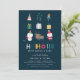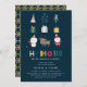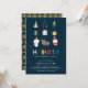 "HO HO HO, estamos tendo um bebê!" Convite para Chás de fraldas de Natal. Design apresenta um fundo azul-marinho moderno com pequenas ilustrações festivas bonitinhas e um modelo personalizável em texto branco.