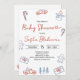 Comemore a época de férias em estilo com este convite de Chá de fraldas de Natal, rústico mas lúdico. Apresentando uma encantadora paleta de cor vermelha e azul, esta design inclui ilustrações festivas como um caminhão vermelho-safra, árvores de Natal, cana-doce, pão-de-gengibre, boneco de neve e presente embrulhado. Acentos feitos à mão e fontes modernas de caligrafia criam um equilíbrio alegre e divertido, perfeito para encontros de férias com amigos, familiares ou colegas de trabalho. Personalize com os detalhes do seu partido por um toque personalizado e espalhe a alegria de Natal com um convite que se destaca.