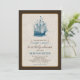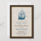 Convide seus amigos para um chá de fraldas náutico com tema, com o convite a chá de fraldas deste menino marrom e azul, com um navio antigo, vintage, uma borda de corda e âncoras.
