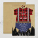 Design para um cartão de Chá de fraldas "Boy": uma magnífica tipografia em um traje de bebê xadrez de búfalo vermelho com shorts de denim, árvores em um fundo de papel velho e rústico. Use a ferramenta Personalizar para adicionar suas informações. Para obter mais informações, visite por favor minha Coleção de Festas de Xadrez/Lumberjack.