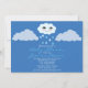 Um convite para chás de fraldas moderno e adorável com um fundo azul, com uma nuvem de chuva feliz.