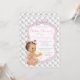 Diamantes e convite para chás de fraldas pérolas com uma adorável menina vestindo calças roxas cor-de-rosa e cordas de pérolas em um lindo fundo de diamante tufado com prata bonito e fundo de arco rosa. Este adorável convite para diamantes cor-de-rosa e cinzas e chás de fraldas cor-de-rosa é facilmente personalizado para o seu evento simplesmente adicionando os seus detalhes no estilo de letra e na redação da sua escolha. Este é um design impresso sem diamantes reais, pérolas, tufos, brilho, etc.
