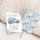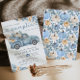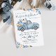 Convite de chá de fraldas de outono com design rústico, incluindo um caminhão de coleta, abóboras e folhas de outono. O esquema de cor azul e laranja empoeirado é complementado com a fonte serif clássica e o script de incerteza.