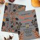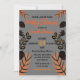 O convite de chá de fraldas personalizado moderno mostra folhagem de outono desenhada à mão, folhas e cones de pinho em tons de preto e laranja contra um pano de fundo de cinza. O texto pode ser completamente adaptado às suas preferências.