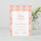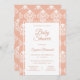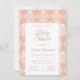 Belo convite para chás de fraldas ornamentais. Um moderno e estilizado padrão ornamental Barroco, branco, sobre fundo de pêssego coral. Edite facilmente a modelo para se adequar ao evento do seu chá de fraldas. O Barroco Patterned Coral Chá de fraldas Invitation. O código hexadecimal de cor do fundo é #F1B9A3.