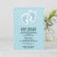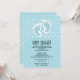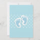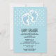 Chá de fraldas convite com uma imagem encantadora de pegadas azuis do bebê com um contorno branco pesado. Bolinhas brancas sobre um fundo azul bebê atrás da ilustração.