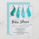Chá de fraldas russo boêmico com quatro penas azuis e lacrimogêneas contra fundo de pássaro impresso. Chá de fraldas é escrito em um encantador roteiro de pincel. A parte traseira apresenta pequenos pontos brancos bonitos sobre um fundo azul claro.