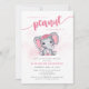 Chá de fraldas de Elefante Rosa Menina de Amendoim Convite com um elefante cor-de-rosa giro sentado. O amendoim da caligrafia está a caminho da design.