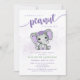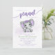 Chá de fraldas de Elefante Roxo para Menina de Amendoim com um elefante roxo giro sentado. O amendoim da caligrafia está a caminho da design.