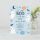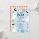Chá de fraldas de Boo do Halloween Azul moderno Convite para o chá de fraldas temático de Halloween do menino doce, com alguns fantasmas, abóboras, morcegos, cogumelos e folhagem. Este nosso pequeno boo está no caminho do convite para chás de fraldas é ideal para um chá de fraldas de outubro para um bebê.