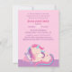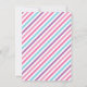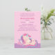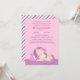 Um belo e doce convite de chá de fraldas com a ilustração de um pequeno unicórnio bebê dormindo em travesseiros confortáveis. Uma paleta colorida de rosa, roxo e azul que é perfeita para a celebração da chegada rápida de uma menina. No verso está um padrão de faixas inclinadas com a mesma paleta de cores. Personalize facilmente com os detalhes do seu partido.
