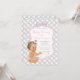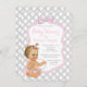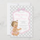 Chá de fraldas de pérolas com uma adorável menina vestindo calças cor-de-rosa e cordas de pérolas em um lindo fundo de pérolas tufadas com bonito fundo de arco rosa. Este adorável convite para chás de fraldas cor-de-rosa é facilmente personalizado para o seu evento simplesmente adicionando os seus detalhes no estilo de letra e na redação da sua escolha. Este é um design impresso sem pérolas reais, tufagem, brilho, etc.