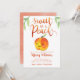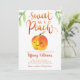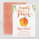 Cartão de modelo de convite para chá de fraldas de uma garota com um tema de pêssego bonito, apresentando uma ilustração de um pêssego com um sorriso no rosto. O texto da tipografia escrito à mão acima diz "doce como pêssego". Placa de excelente para chás de primavera e verão.