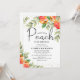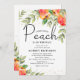 Cartão de convite para chás de fraldas neutro de gênero. Design apresenta ilustrações aquarelas dos pêssegos da fruta de jardim, verde-verde e confete de coração dourado em um fundo branco clássico. O elegante modelo é fácil de personalizar com os detalhes do seu próprio chá de fraldas. Perfeito para um chá de fraldas no verão!