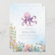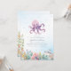 Um convite para chá de fraldas de polvo e super fofo. Um polvo adorável toma palco central neste convite de aquarela. Há também um tubarão sorridente a sair do canto e pequenos cavalos marinhos num recife de coral! Este convite encantador é perfeito para uma festa temática do mar ou do oceano. Veja a coordenação de itens no nosso compro, Encantado Finch.