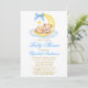 Urso de Pau-Água na Lua e nuvens com Convite para Chá de fraldas de arco Azul. Texto Dourado e Azul. Blue Back com Bolinhas.