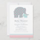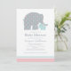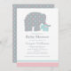 Na moda e doce convite de chá de fraldas neutro em gênero apresenta um elefante-mãe e seu recém-nascido bezerro de elefante. O design combina bolinhas lúdicas e listras clássicas, e um esquema de cores quicas de branco, rosa claro, azul aqua e cinzas.