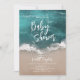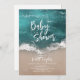 O convite para chás de fraldas romântico costeiro apresenta belos abstrato de cor d-d-água cintilante fundo oceânico onda e praia, repletos de na moda e detalhes elegantes de eventos de fontes, modernos e simples, excelente para festa de praia em areia tropical, festa temática do oceano costeiro. Veja todas as peças correspondentes na coleção.