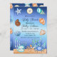 Caranguejo desenhado à mão, conchas, estrelas, peixe-estrela, e convites para chuveiros de bebês de garotinho e coral azul com um tema de praia.