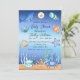 Adoráveis cartas desenhadas à mão de golfinhos, caranguejos, conchas, estrelas, dólar e chuveiros de bebês de menino azul-coral com um tema de praia.