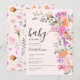Bebê em Bloom! Flores silvestres românticas pastéis chás de fraldas de verão com bonito flores selvagens em cor-de-rosa, pêssego, roxo, lavanda, folhas verdes e muito mais, com uma tipografia com script escovado sobre um elegante e editável fundo rosa pastel macio.