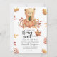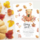 "Há um bebê Beary Sweet a caminho". Celebrar com esta festa de chá de fraldas do ursinho de pelúcia! Ursinho de pelúcia bonitinho com uma abóbora de outono nas patas do outono. No verso do cartão estão as folhas do outono.